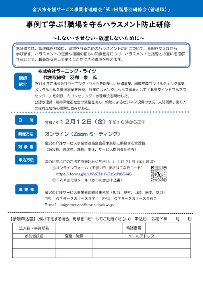 対象:金沢市介護サービス事業者連絡会会員事業所に勤務する管理職