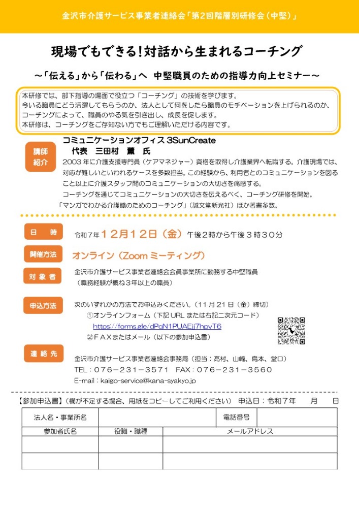 対象:金沢市介護サービス事業者連絡会会員事業所に勤務する中堅職員
